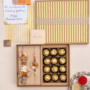 GUL in Rangoli Box with 12 ferrero rochers and roli chawal
