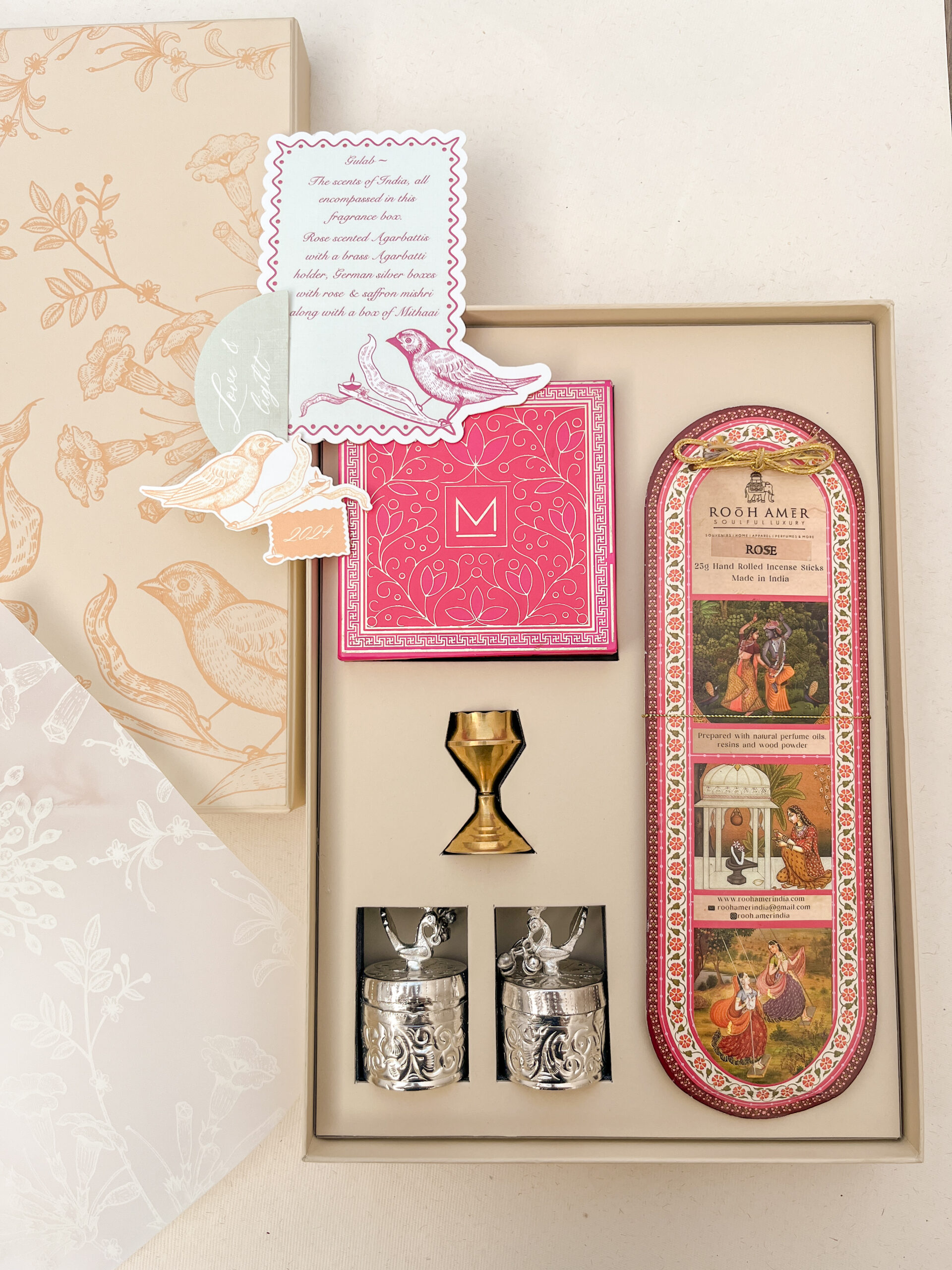 The scents of India, all encompassed in this fragrance box. Rose scented Agarbattis from the Palace Shop -Jaipur, with a brass Agarbatti holder, 2 handcrafted German silver boxes with rose & saffron mishri & box of delectable Mithaai from the brand Misree