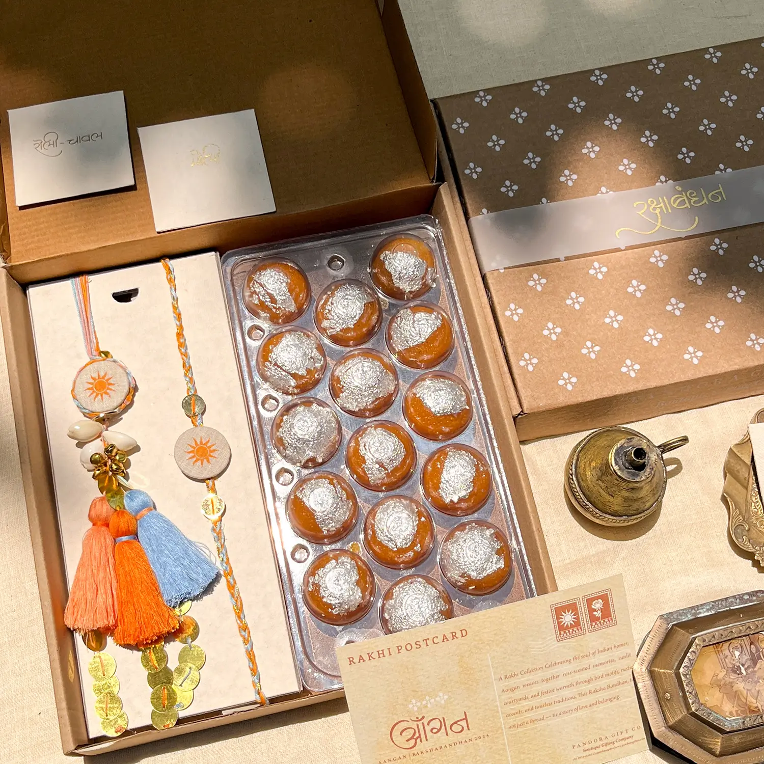 HomeRakhi 2025Aangan – A Rakhi CollectionRangoli Box with Banarasi boondi ladoo and roli chawal – Kiran